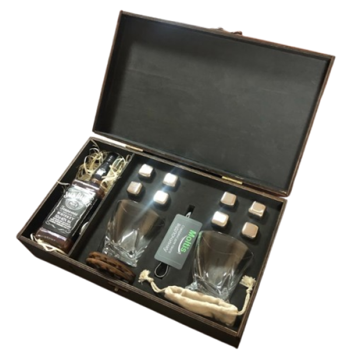 1. Якісна дерев'яна подарункова упаковка 40 на 24 см на 11 см у темному дереві + секція для віскі. Внутрішня частина - це м'який оксамитовий ложемент (камені та келихи завжди будуть цілі та красиво, престижно зберігається) в якому лежать оригінальні камені для віскі 8шт, мішечок для каміння, 2 келихи на вибір, щипці та 2 підставки під келихи, віскі не входить