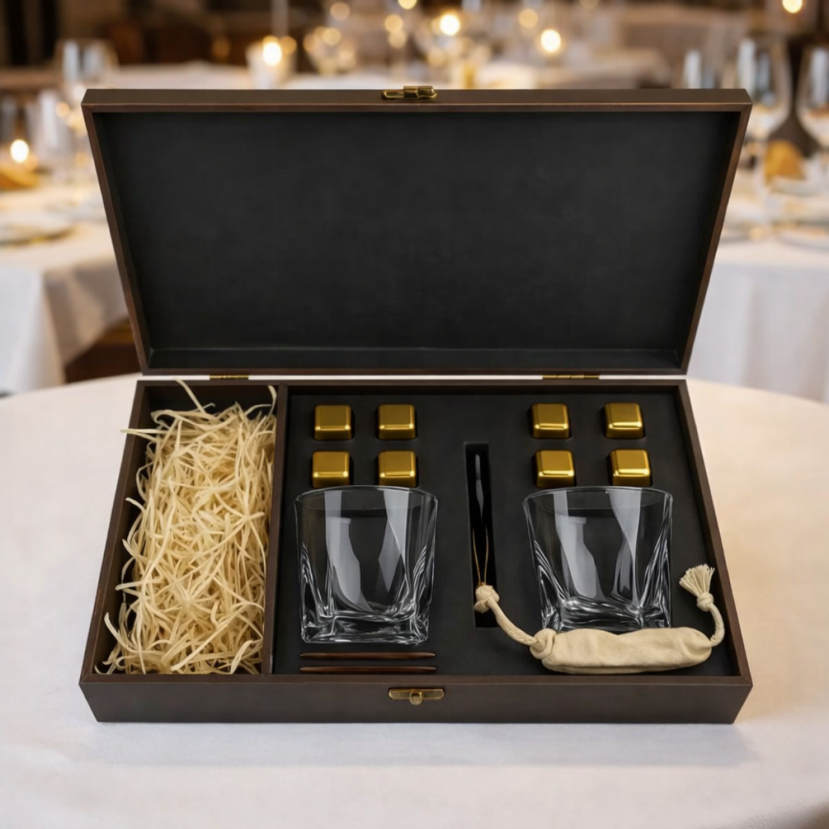 1. Якісна дерев'яна подарункова упаковка 40 на 24 см на 11 см у темному дереві + секція для віскі. Внутрішня частина - це м'який оксамитовий ложемент (камені та келихи завжди будуть цілі та красиво, престижно зберігається) в якому лежать оригінальні камені для віскі 8шт, мішечок для каміння, 2 келихи на вибір, щипці та 2 підставки під келихи, віскі не входить