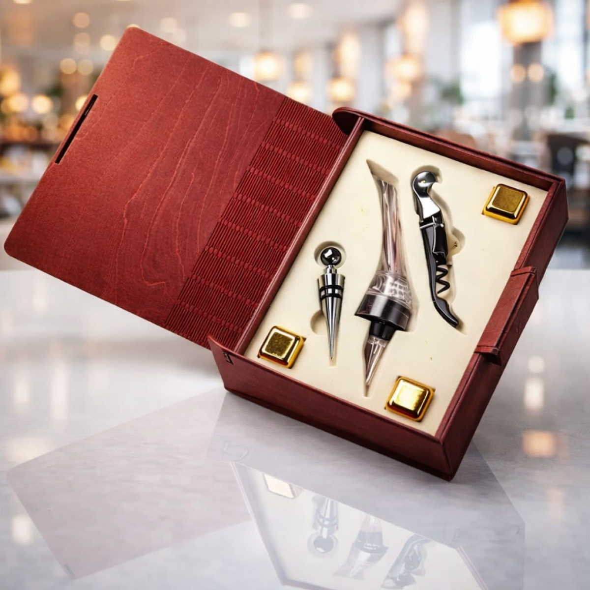 Завдяки продуманій комплектації, набір забезпечує максимальний комфорт у використанні та дозволяє повністю розкрити смакові якості вина. Кожен елемент створений для того, щоб зробити процес подачі напою зручним, естетичним і приємним.