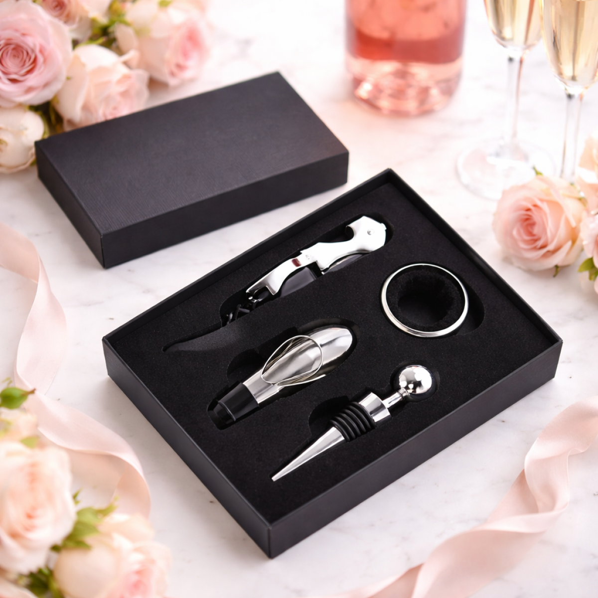 Подарунковий винний набір 4 в 1 у стильній коробці — це ідеальне рішення для поціновувачів вина, яке поєднує практичність, елегантність і зручність у використанні. Чудово підходить як для особистого користування, так і як універсальний подарунок.